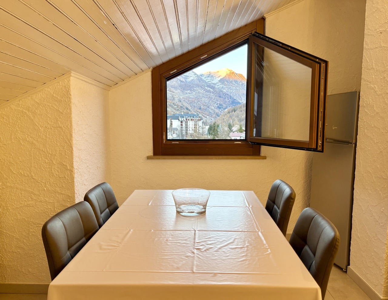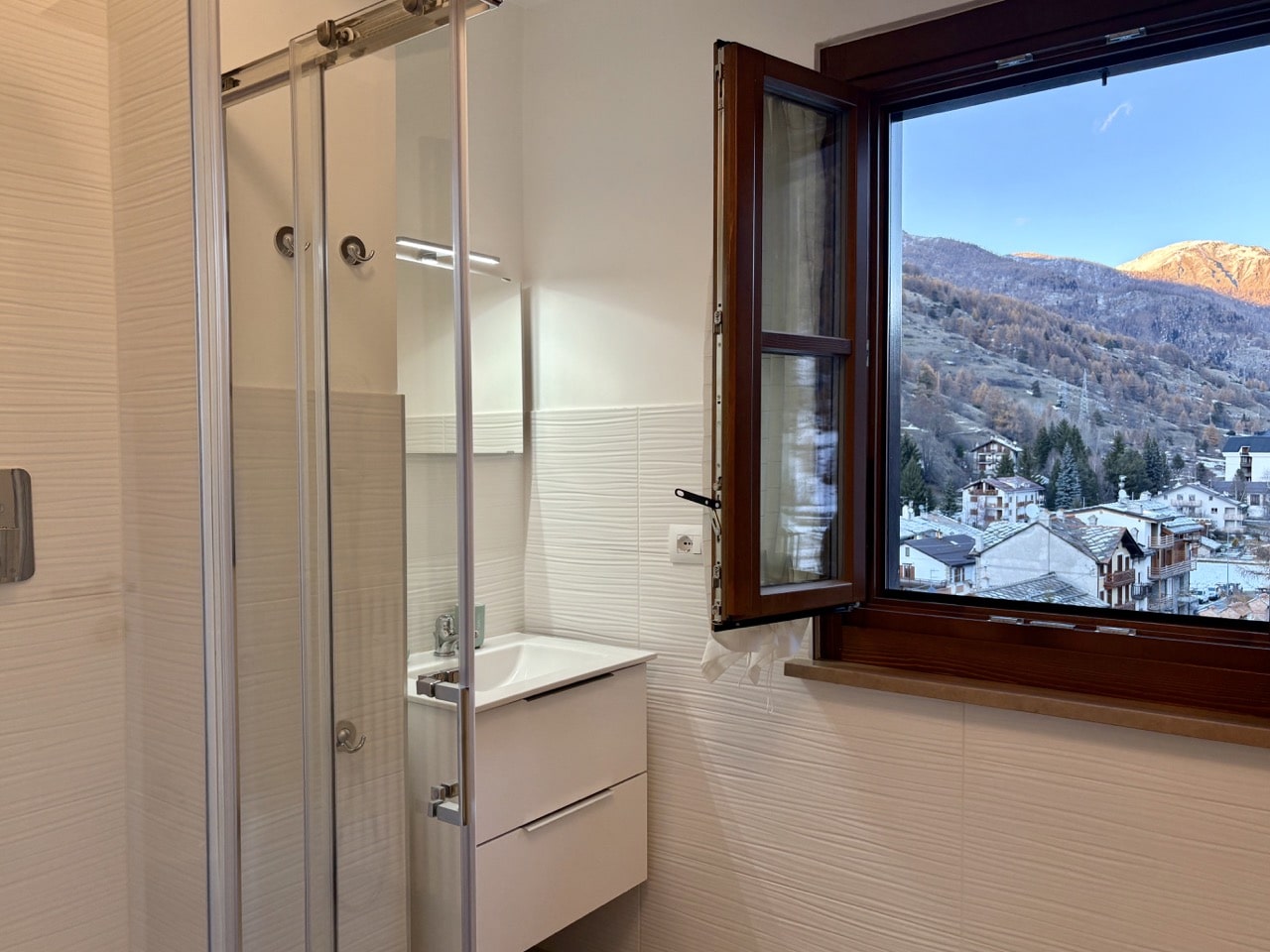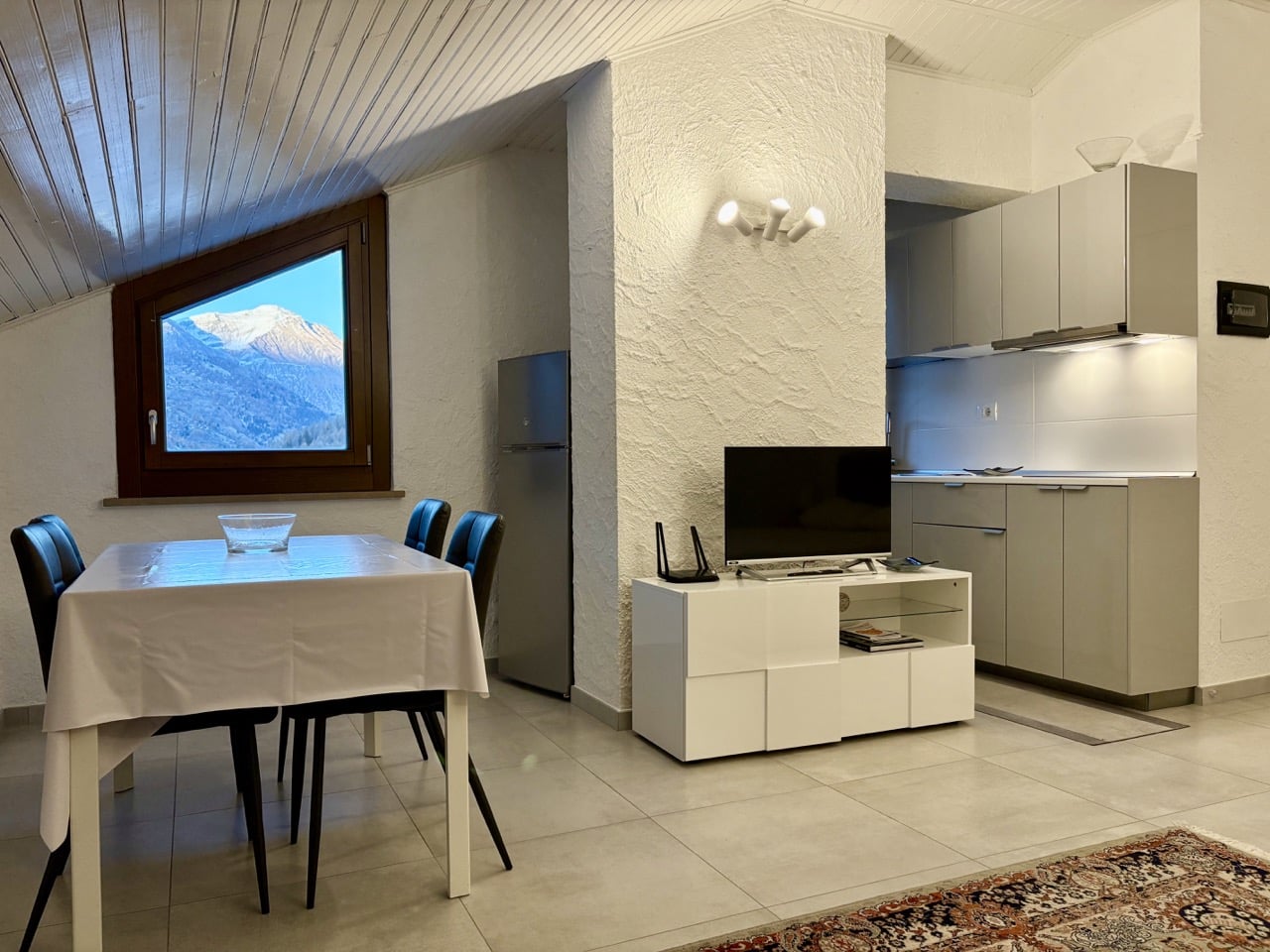 L’ingresso conduce a un disimpegno arredato con armadiature capienti, mentre il soggiorno, accogliente e ben organizzato, ospita un letto matrimoniale e un divano letto, offrendo un’atmosfera calda e funzionale. Il cucinotto, compatto ma estremamente pratico, è attrezzato con piastra a induzione, lavatrice, lavastoviglie e frigorifero. Il bagno, finestrato, è dotato di doccia e boiler elettrico. L’esposizione a est, unita alle ampie finestre, dona una luminosità piacevole che valorizza gli spazi, mentre la vista aperta sulle montagne e sul borgo di Ruà crea un quadro naturale sereno e rilassante.