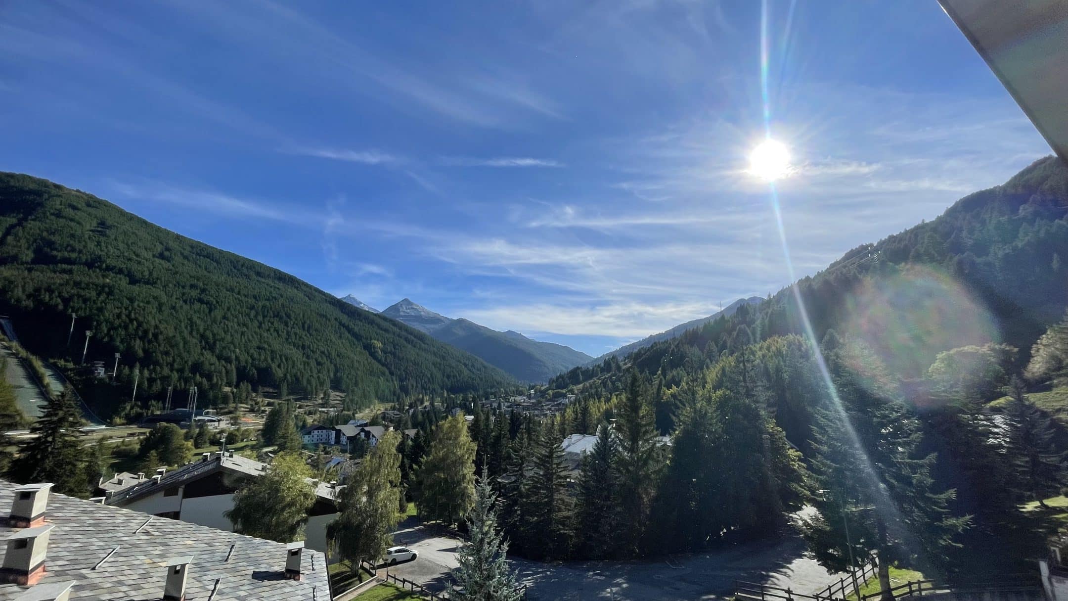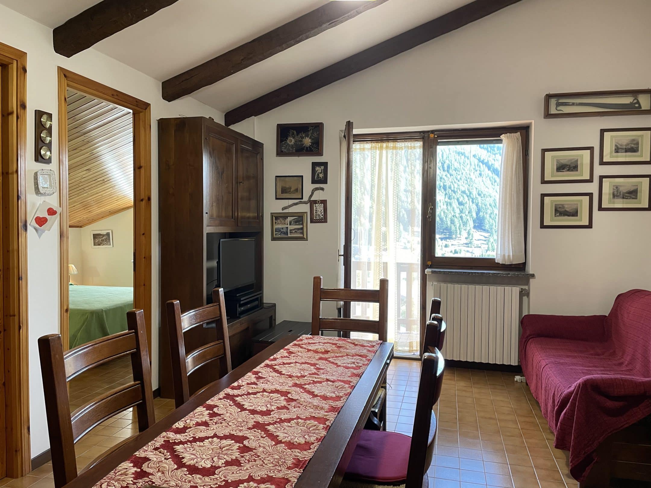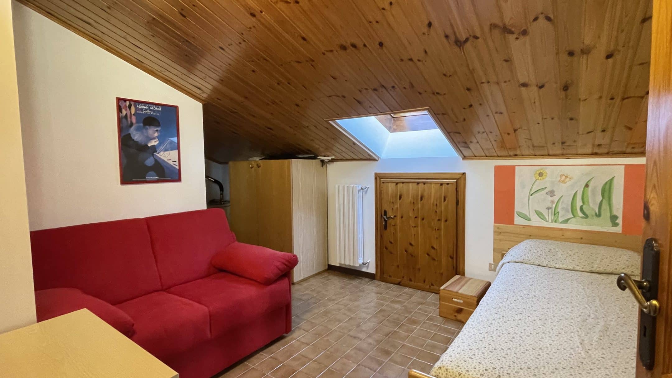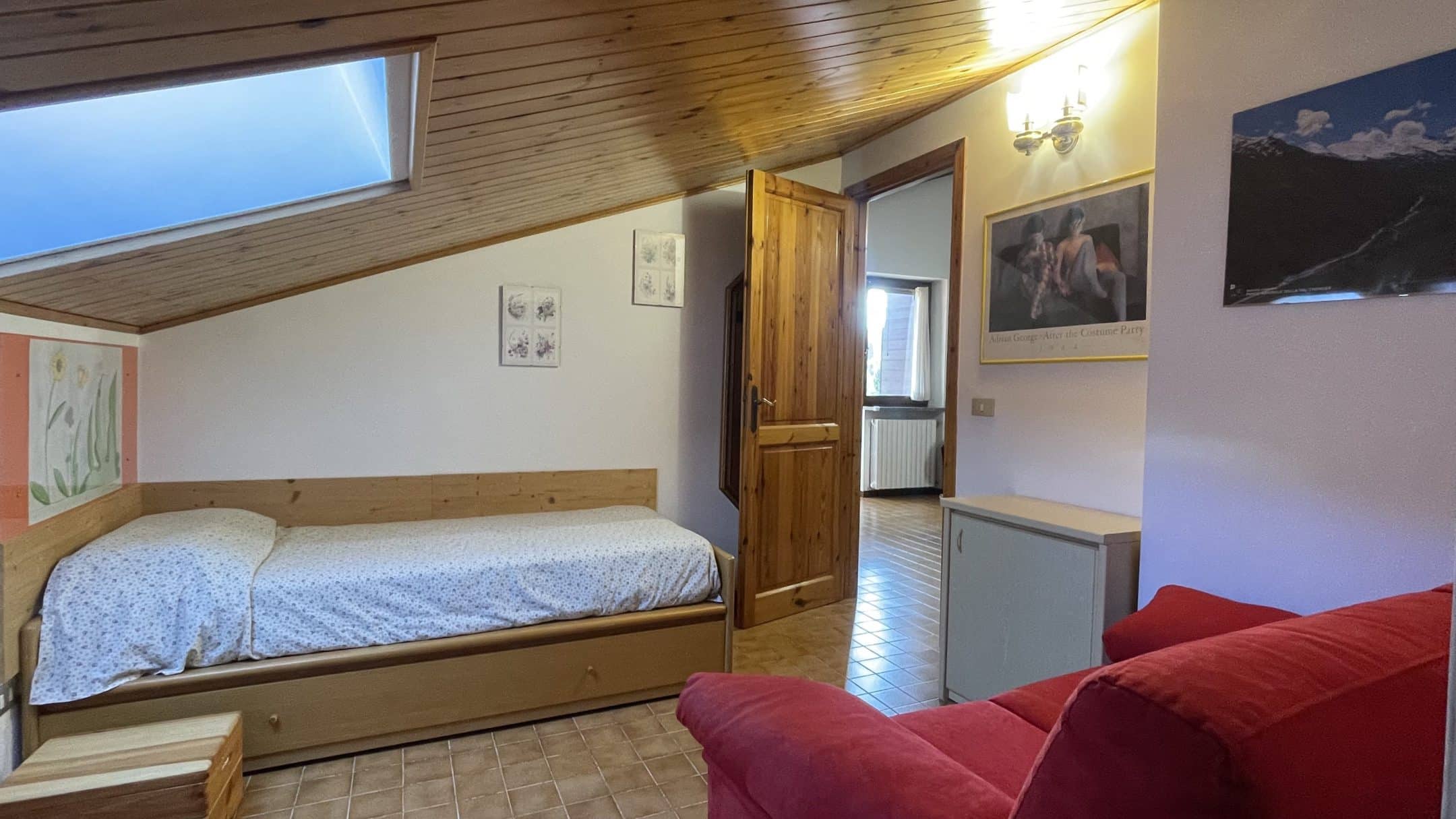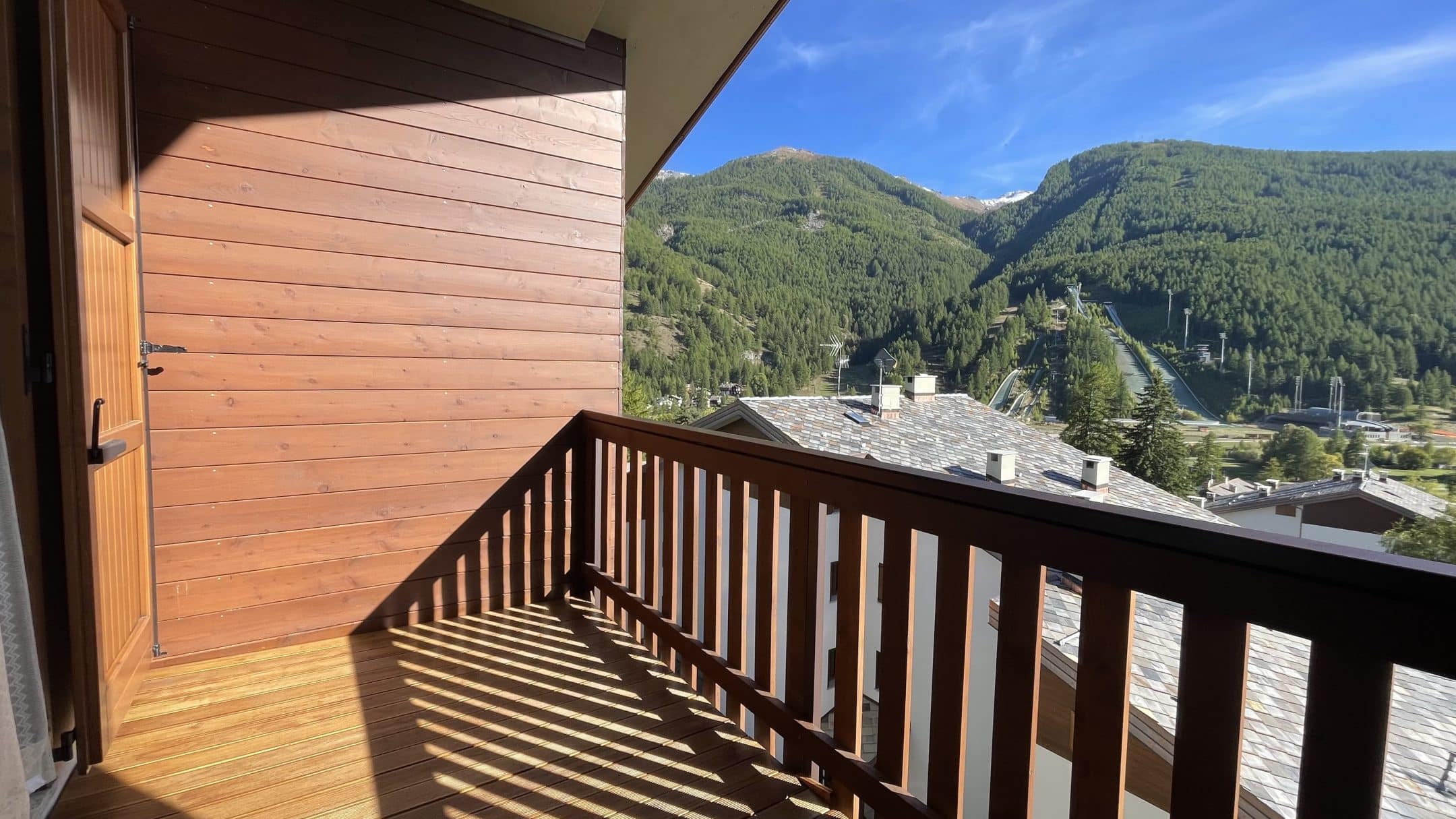 Il soggiorno con angolo cottura si apre su un grande balcone esposto a sud, dove lo sguardo spazia sulle cime innevate e sui paesaggi montani. La zona notte comprende una camera matrimoniale, una cameretta e un bagno con finestra.