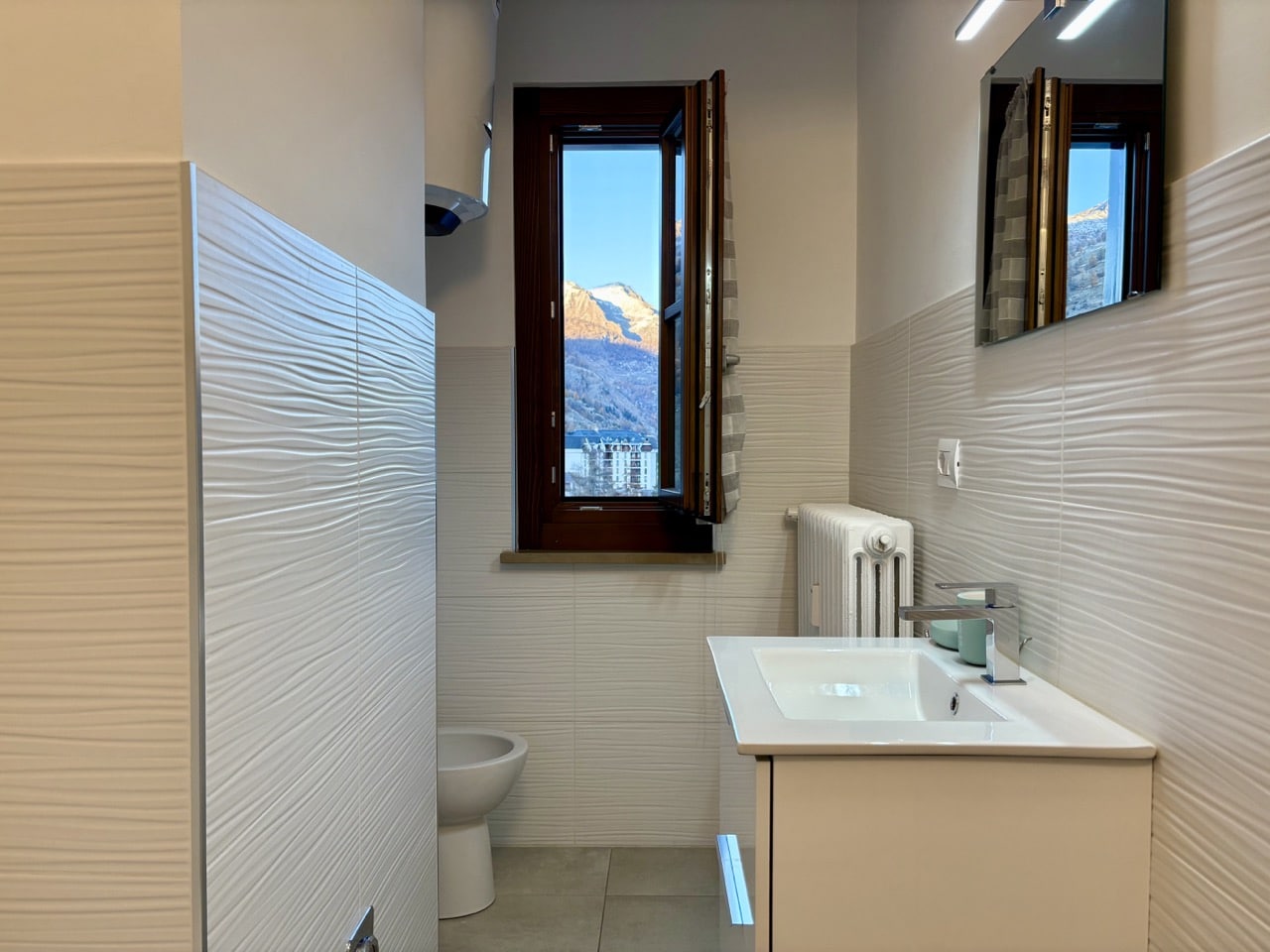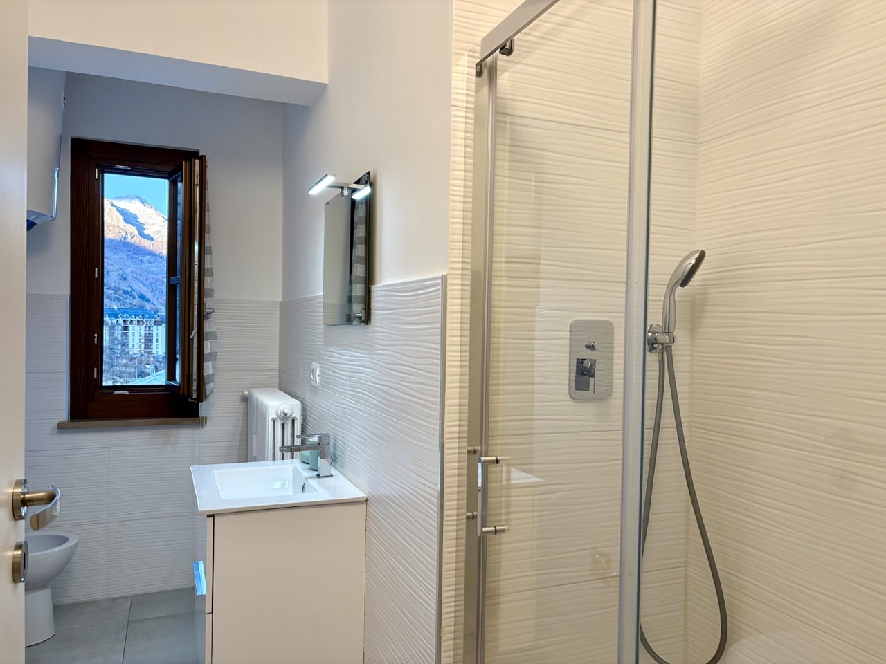 Il bagno, finestrato, ospita doccia, sanitari moderni e boiler elettrico per la produzione di acqua calda sanitaria.