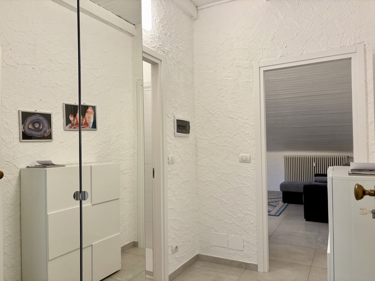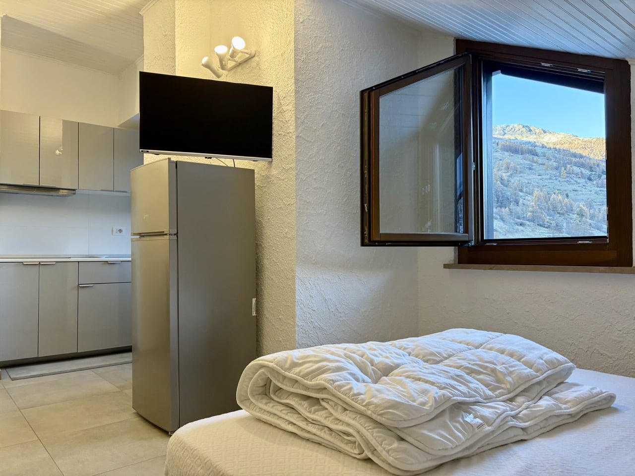L’ingresso si apre su un disimpegno attrezzato con ampio armadio su misura e cassettiera/scarpiera; segue un soggiorno luminoso, arredato con letto matrimoniale e divano letto, curato e pensato per ottimizzare al massimo lo spazio. L’angolo cottura, razionale e moderno, è dotato di piastra a induzione, lavatrice, lavastoviglie e frigorifero a libera installazione, perfettamente integrati nel layout della cucina.
