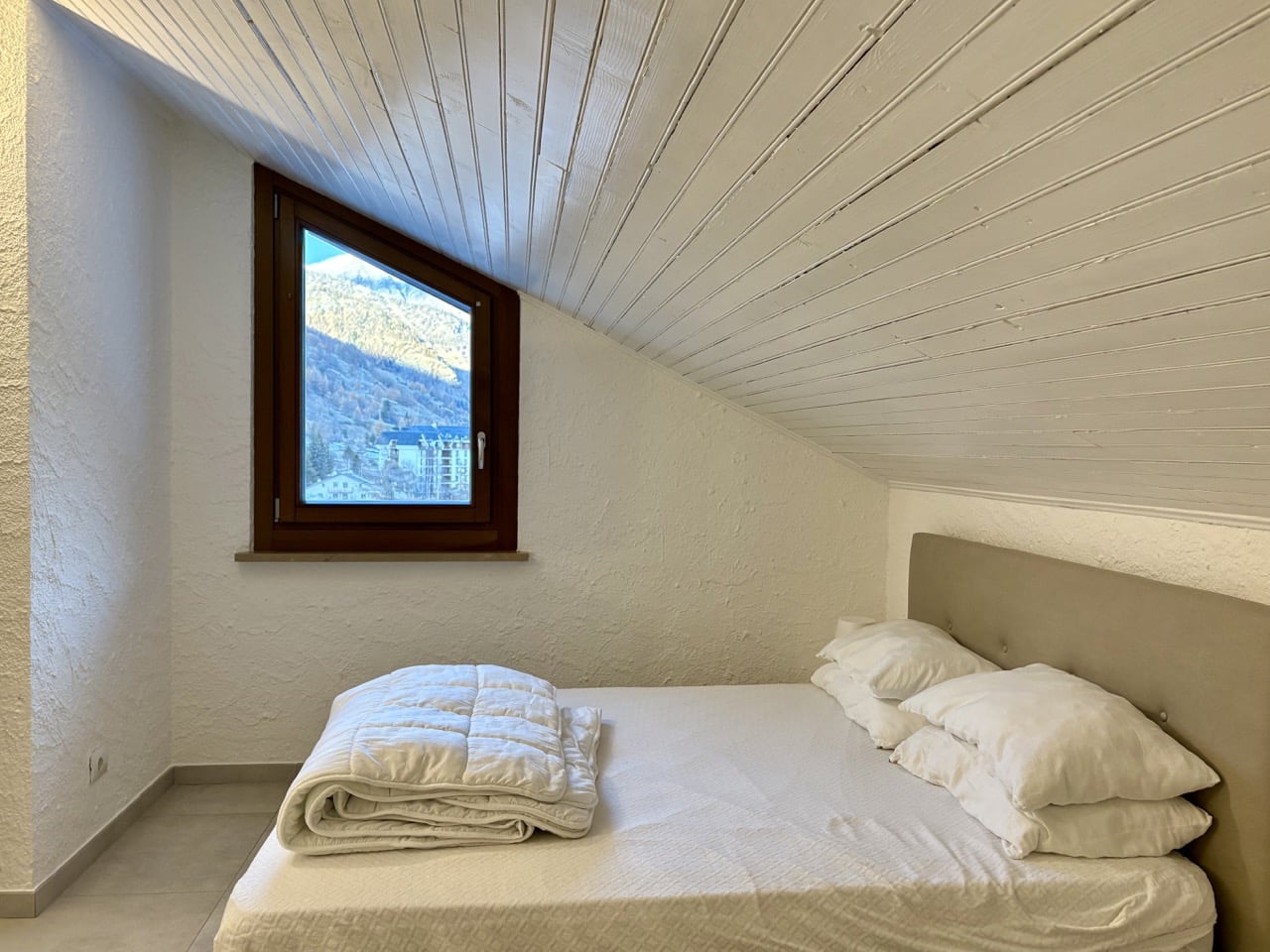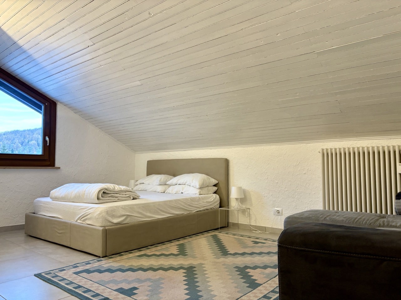 La vista è splendida e abbraccia il borgo di Ruà e le montagne circostanti, offrendo un quadro che cambia armoniosamente con il susseguirsi delle stagioni; nonostante l’esposizione a est e l’assenza del balcone, la mansarda risulta sorprendentemente luminosa grazie alla buona finestratura e al taglio dell’ambiente che rendono l’atmosfera accogliente e distensiva.